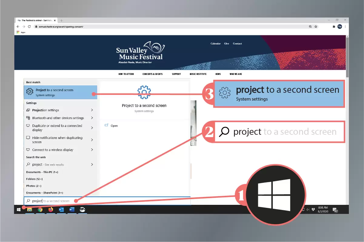 (1) Click on the Windows icon at the bottom left of the screen, (2) type the word “project,” and (3) select “project to a second screen.”