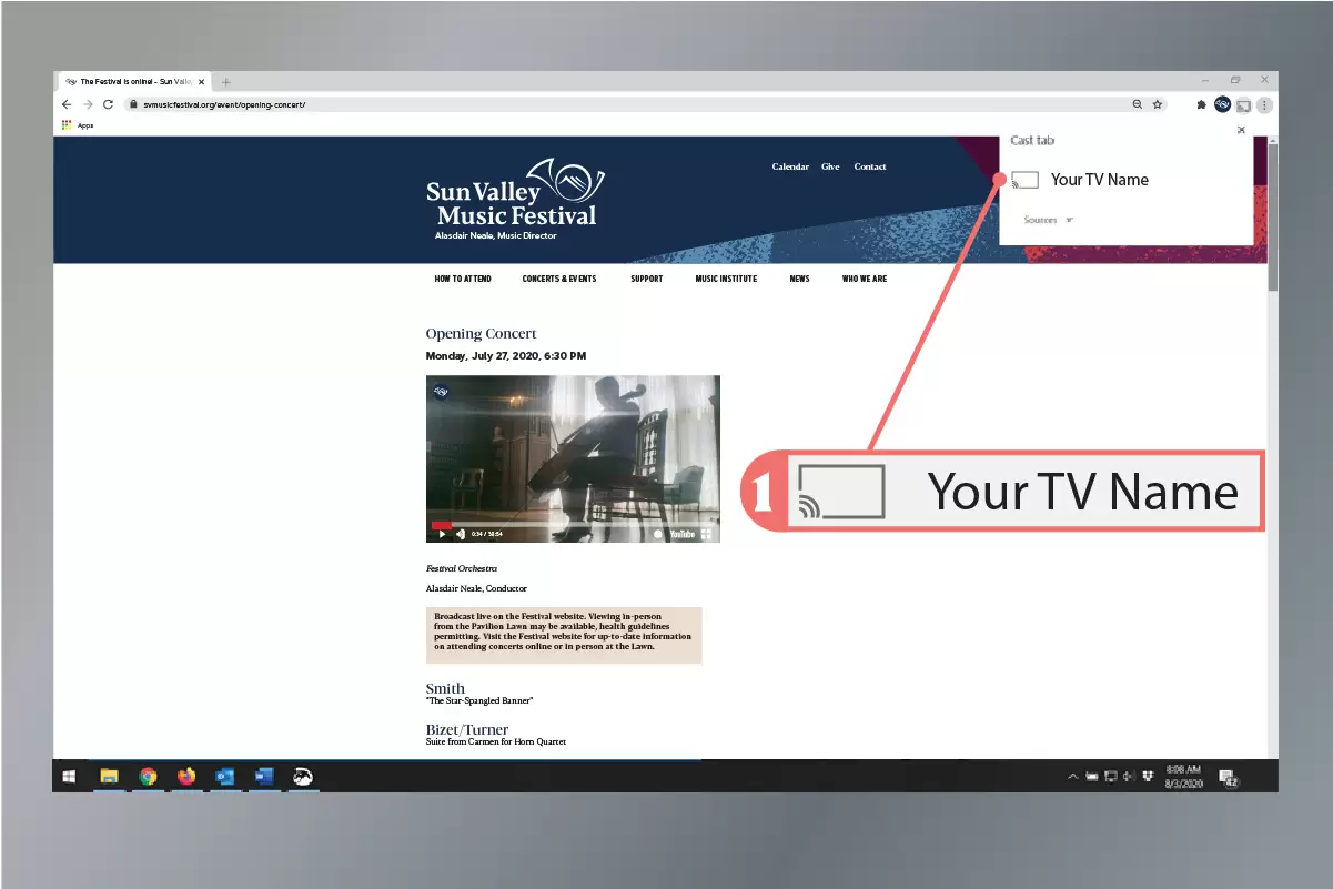 Watching an online broadcast is easy: just go to the Festival website (svmusicfestival.org) and click the media player at the top right of the page. For public performances, you can also search for Sun Valley Music Festival on YouTube to find the concert. Please note, private events are only available on the Festival website and can only be accessed using the password credentials provided to you. Whether from the website or YouTube, there are many ways to get the concert from your computer or mobile device onto your TV, including casting your computer or mobile device screen to a smart TV. Find step-by-step instructions on this and more in the sections below.