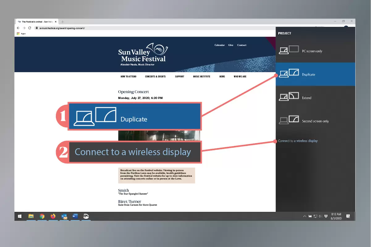 Select (1) “Duplicate” then (2) “Connect to a wireless display”