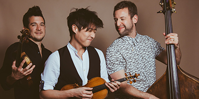 As it happens, string and vocal trio Time for Three—or Tf3 for short—had a similar journey, though they describe themselves as more of a “classically trained garage band.” The 2003 brainchild of violinists Nicolas “Nick” Kendall and Zachary DePue, and double bass player Ranaan Meyer, the three musicians met at Philadelphia’s Curtis Institute of Music, and the two violinists were at one time members of the Philadelphia Orchestra. It was an impromptu acoustic jam session, struck up to pass the time when a thunderstorm caused an electricity outage, that inspired them to take their ideas further. Coming together at first through a common interest in bluegrass and folk fiddling, it was Mr. Meyer who introduced ideas associated with jazz and improvisation into the blend.